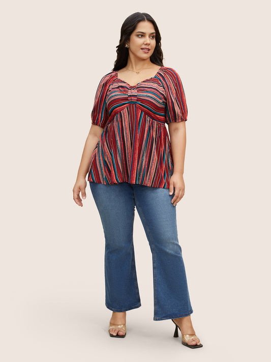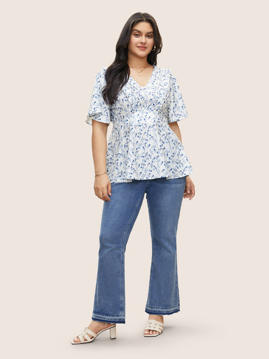 Ditsy Floral Shirred Ruffle Sleeve Elastic Waist Blouse
