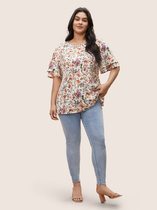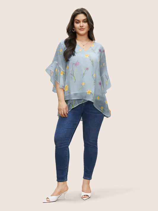 Floral Tiered Mesh Asymmetrical Hem Blouse