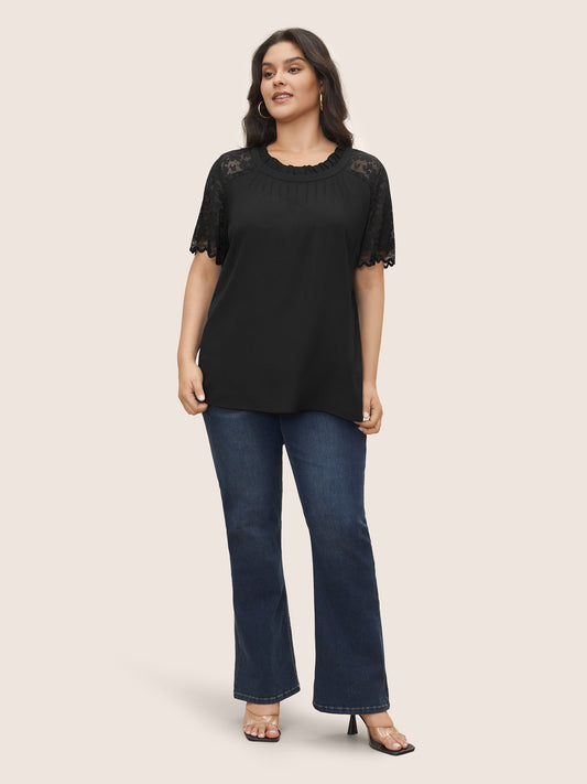 Lace Panel Pleated Frill Trim Raglan sleeve Blouse