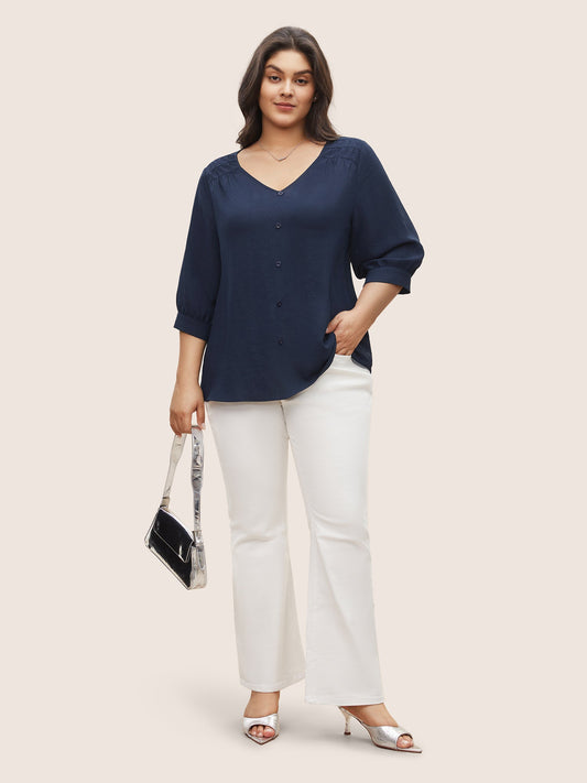 Solid Button Detail Gathered Lantern Sleeve Blouse