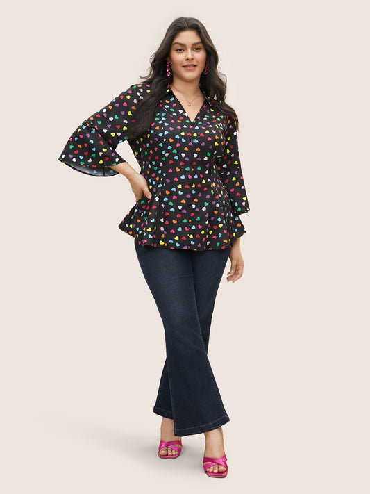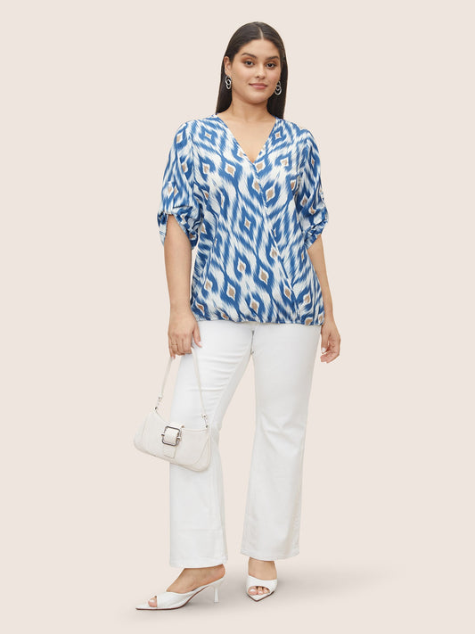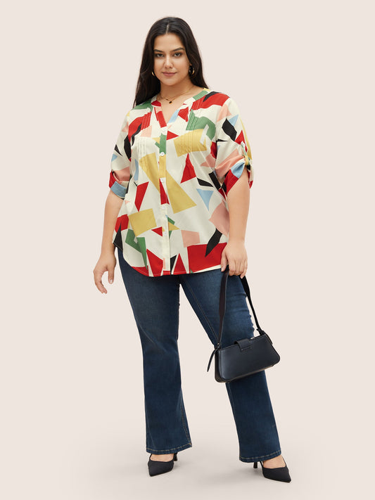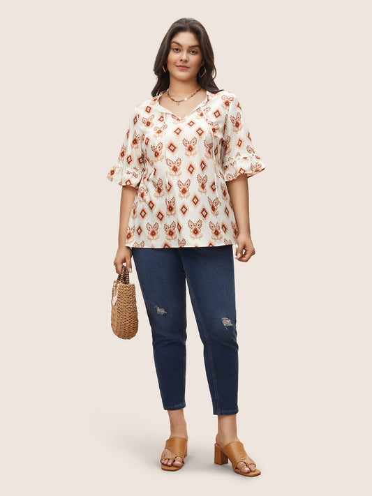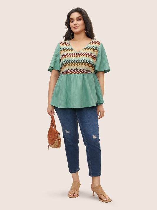 Texture Patchwork Ruffle Sleeve Button Detail Blouse