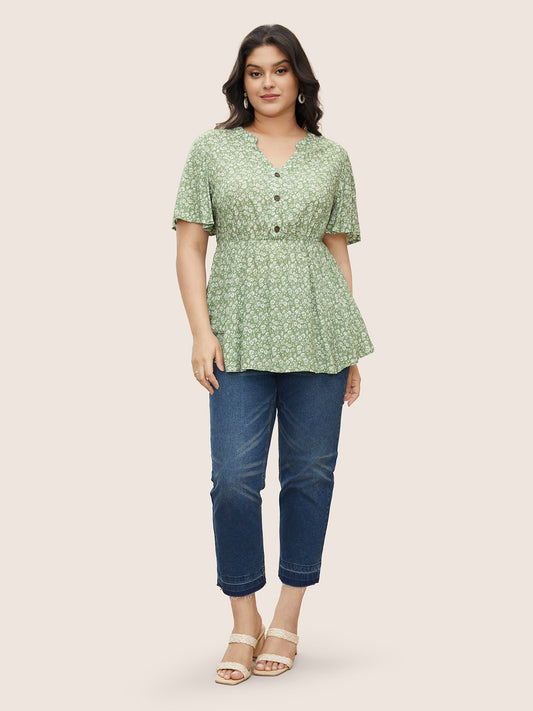 Floral Texture Ruffle Sleeve Gathered Blouse