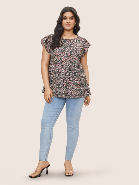 Ditsy Floral Round Neck Ruffle Cap Sleeve Blouse