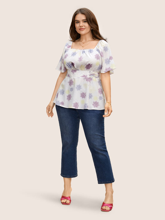 Mock Neck Contrast Floral Flutter Sleeve Blouse