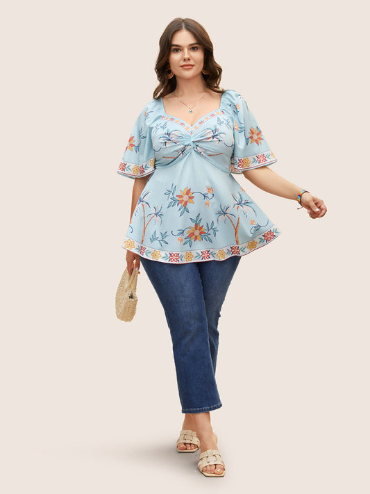 Boho Coconut Tree Print Lantern Sleeve Blouse