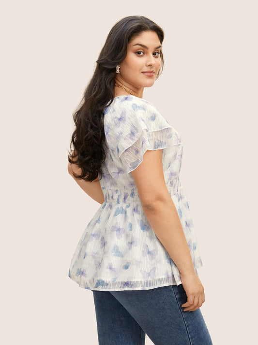 V Neck Butterfly Tiered Ruffles Shirred Blouse