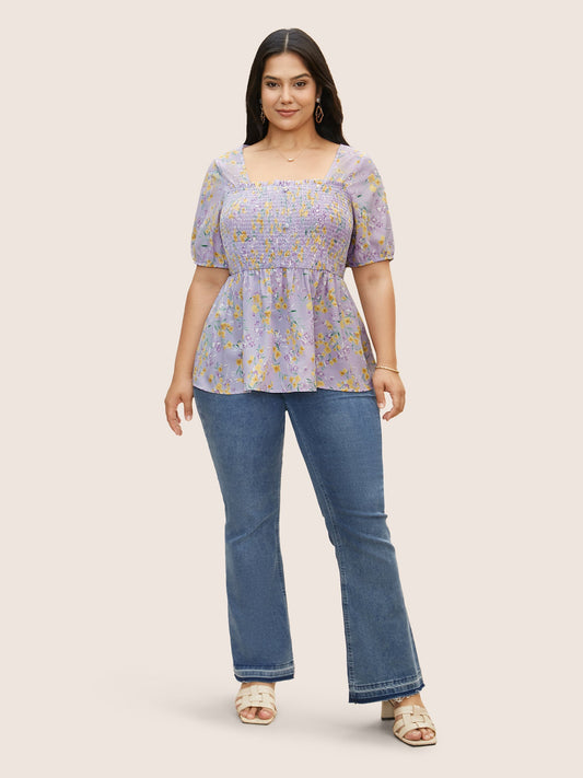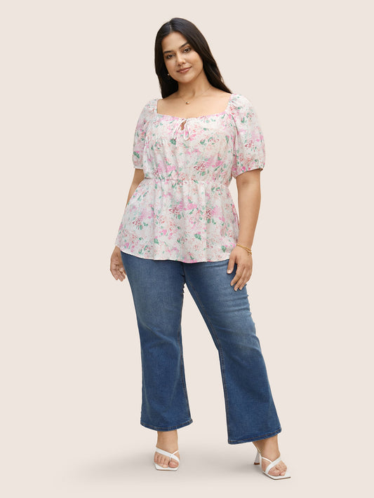Square Neck Floral Puff Sleeve Tie Knot Blouse