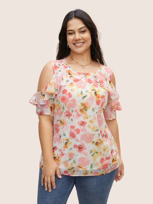 Watercolor Floral Cold Shoulder Ruffles Blouse