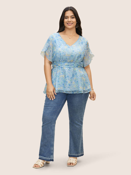 Watercolor Floral Petal Sleeve Ruched Blouse