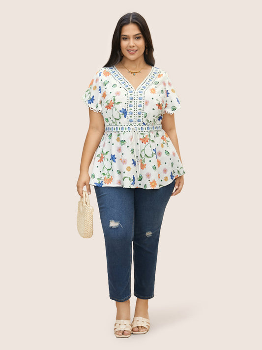 Natural Flowers Print Lace Panel Tie Knot Blouse