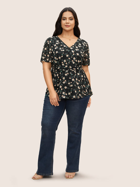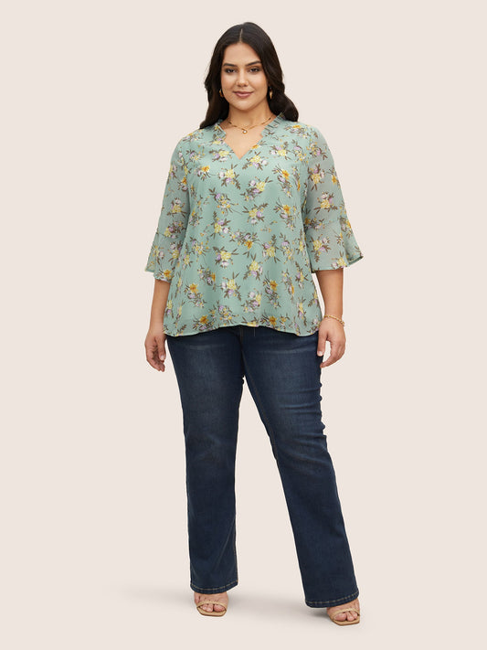 Floral & Butterfly V Neck Bishop Sleeve Blouse