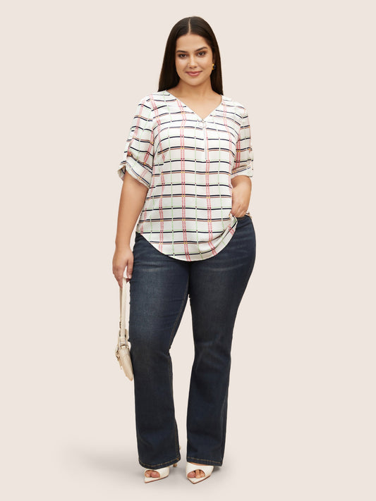 Plaid O Ring Zipper Tab Sleeve Blouse