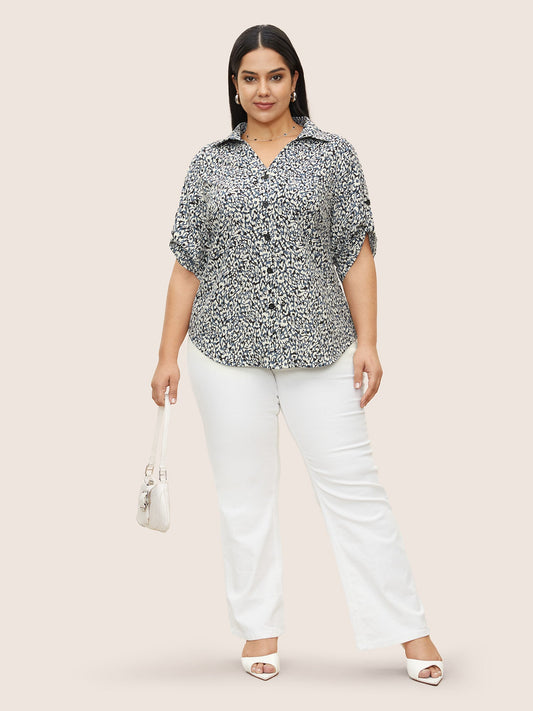 Leopard Print Shirt Collar Tab Sleeve Blouse