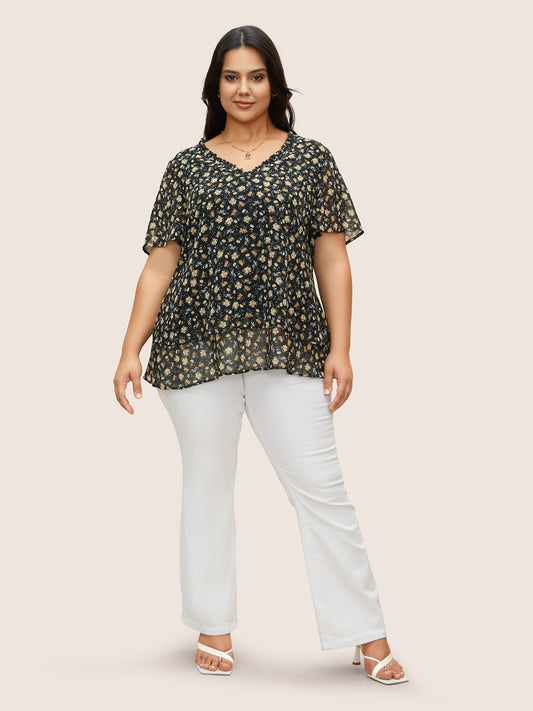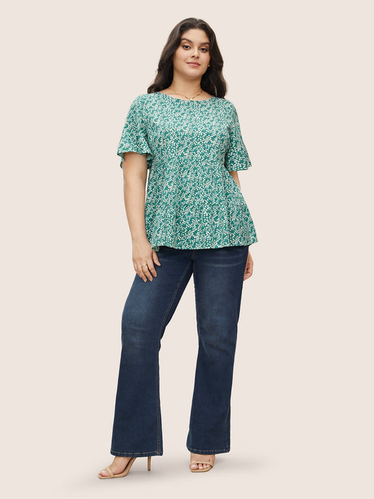 Ditsy Floral Round Neck Flutter Sleeve Blouse