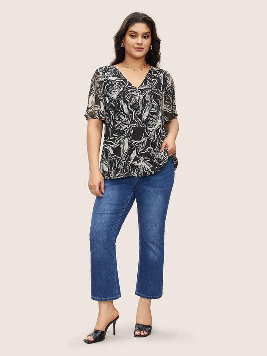 Floral Gathered Button Detail Flutter Sleeve Blouse