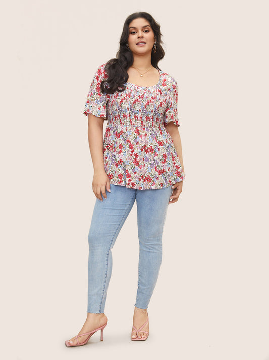 Rayon Floral Print Shirred Ruffle Sleeve Blouse