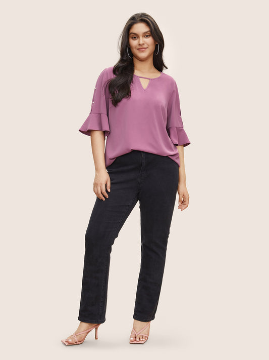 Solid Keyhole Ruffle Sleeve Pearl Beaded Blouse