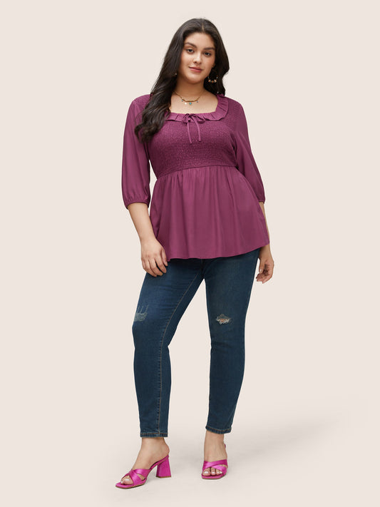 Solid Ruffles Shirred Elastic Waist Ties Blouse