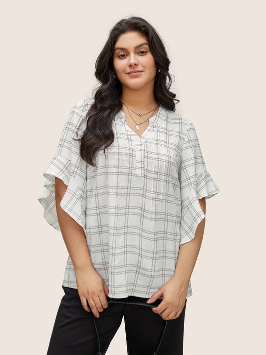 Plaid Notched Patchwork Ruffle Sleeve Blouse