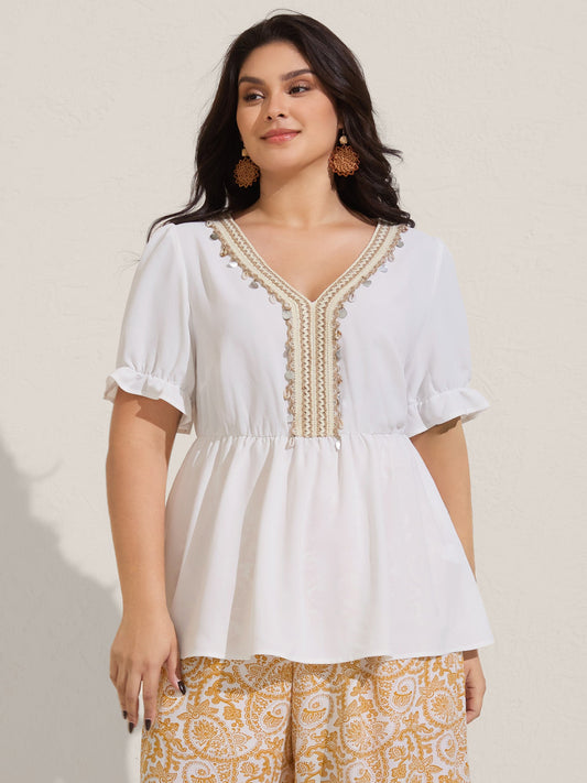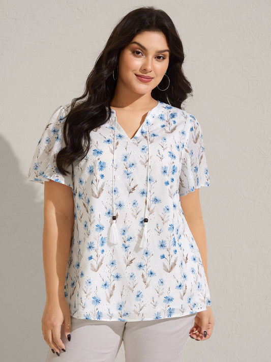 Cotton Embroidered Tassel Tie Flowy Blouse