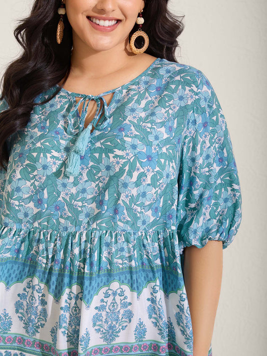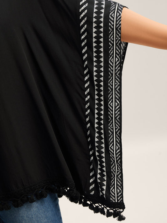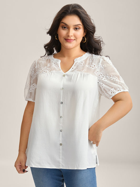 Cotton Stripe Neckline Notched Pleated Sheer Blouse