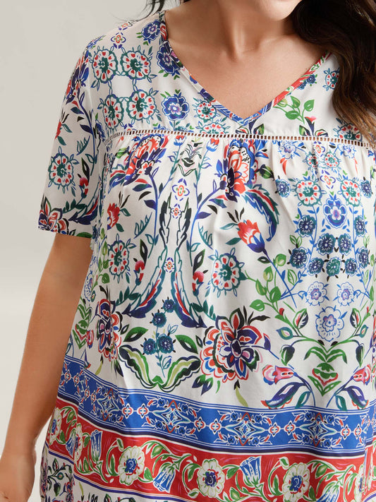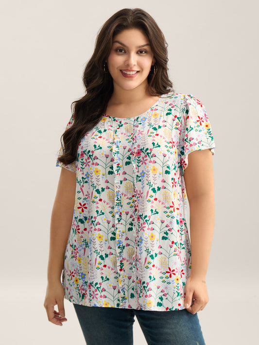 Floral Pleated Bodice Puffy Sleeve Blouse