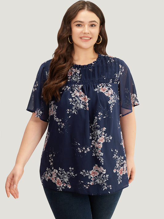 Floral Print Frill Trim Shirred Flutter Sleeve Blouse