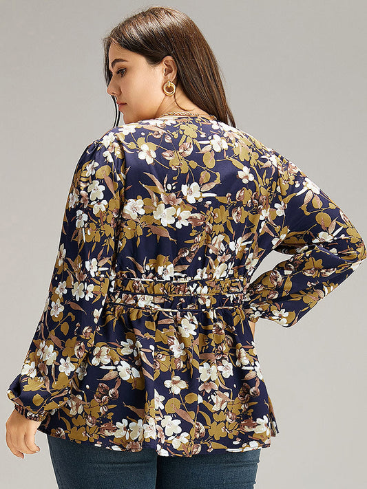 Chiffon Silhouette Floral Print Shirred Frill Trim Blouse