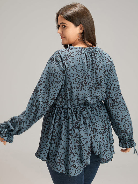 Leopard Asymmetrical Hem Ties Ruffles Blouse