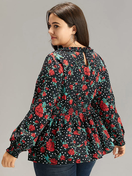 Rose Print Shirred Frill Trim Lantern Sleeve Blouse