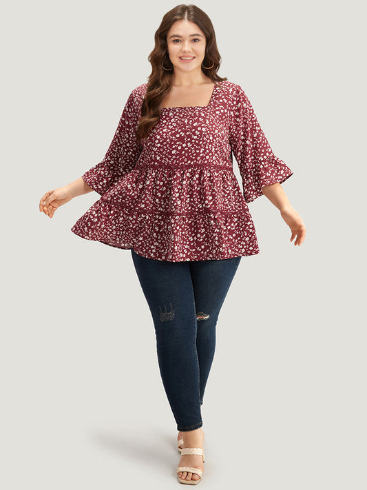 Silhouette Floral Print Lace Patchwork Square Neck Flutters Blouse