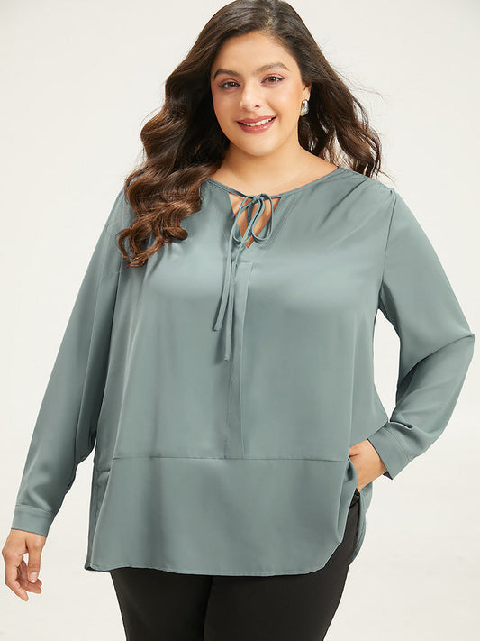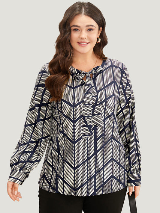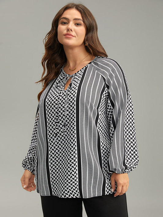 Knot Neck Lace Patchwork Lantern Sleeve Blouse