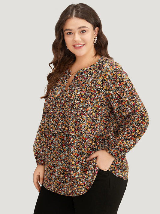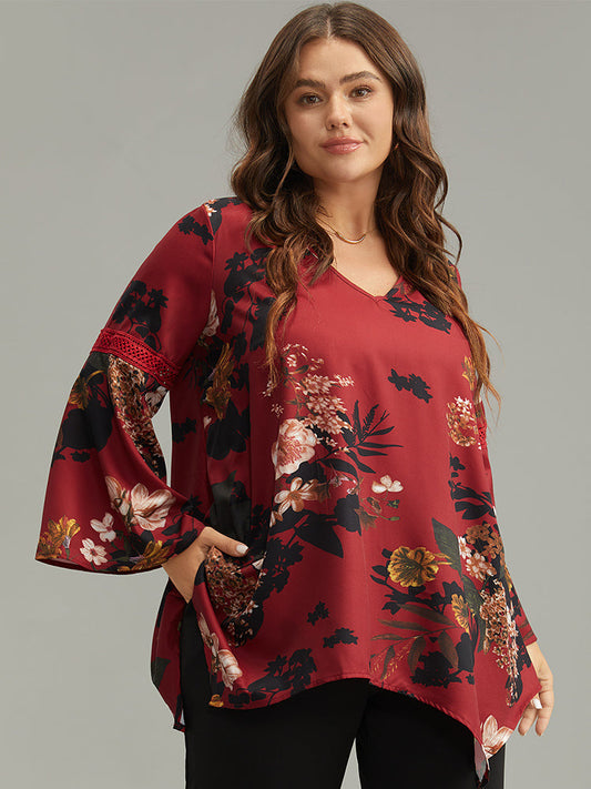 Floral Lace Panel V Neck Hanky Hem Blouse