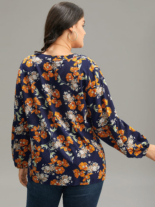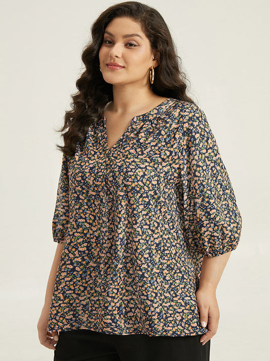 Ditsy Floral Notched Elastic Cuffs Blouse