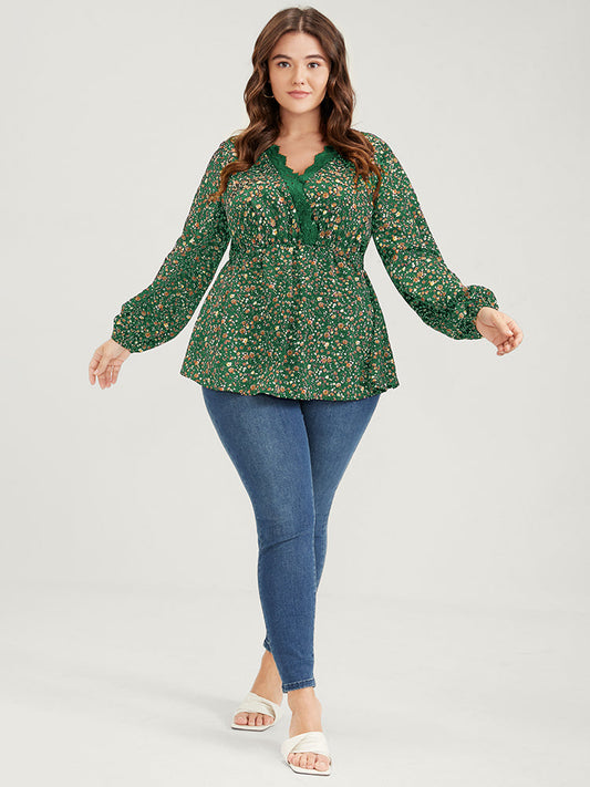 Floral Print Lace Trim Wrap Lantern Sleeve Blouse