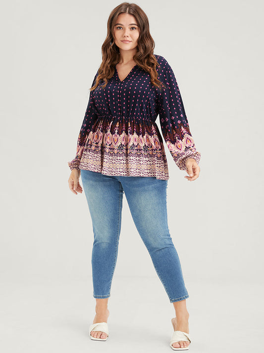 Floral Button Lantern Sleeve Elastic Waist Flutter Blouse