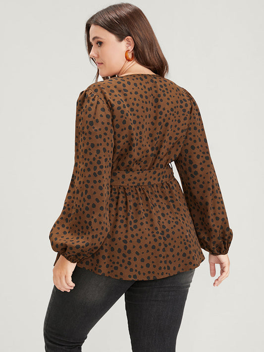 Polka Dot Lantern Sleeve Belted Wrap Blouse