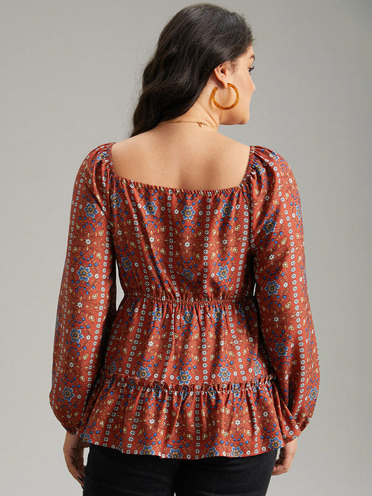 Floral Print Patchwork Elastic Waist Lantern Sleeve Blouse