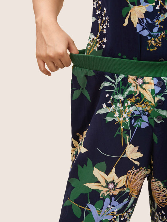Plants Lace Panel Elastic Waist Sleep Bottoms