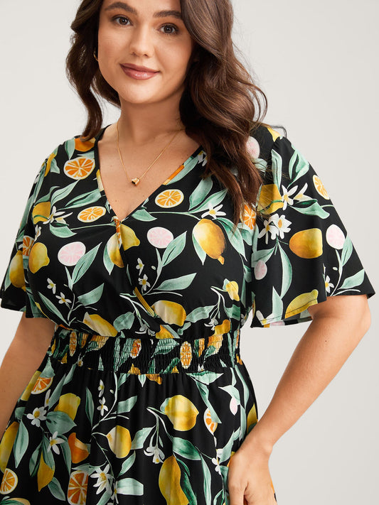 Citrus Print Overlap Neck Shirred Midi Dress