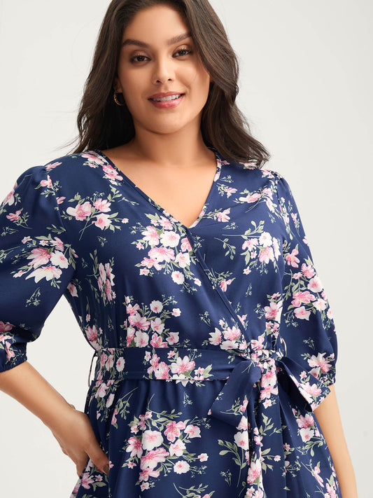 Floral Print Belted Wrap Hem Midi Dress