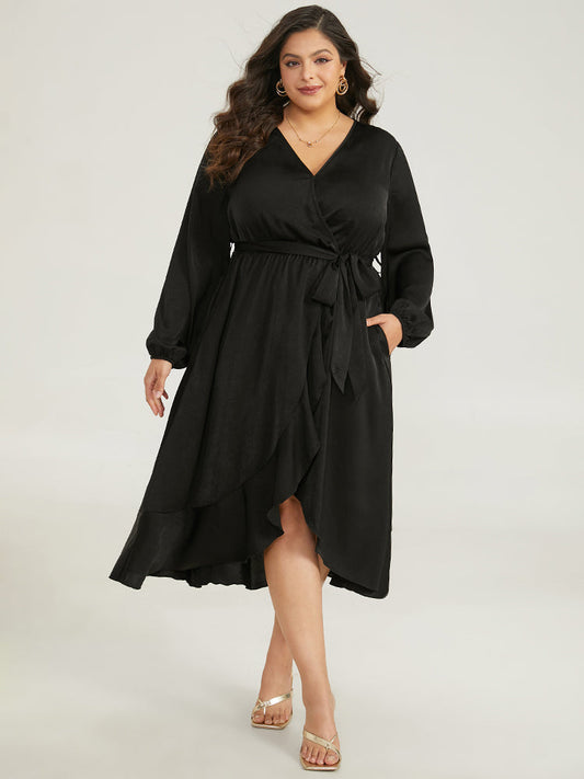 Anti-Wrinkle Square Neck Ruffle Trim Wrap Hem Dress