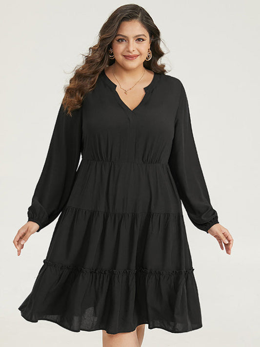 Solid Notched Pocket Layered Hem Elastic Cuffs Dress
