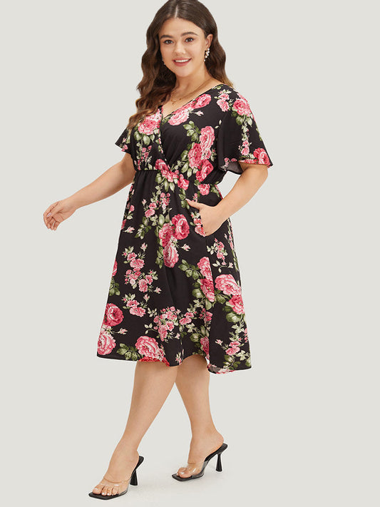 Floral Print Ruffle Sleeve Pocket V Neck Wrap Dress