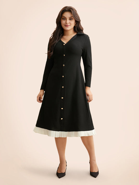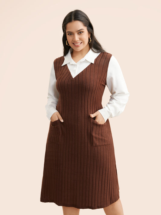 Shirt Collar Rib Knit Patchwork Dress