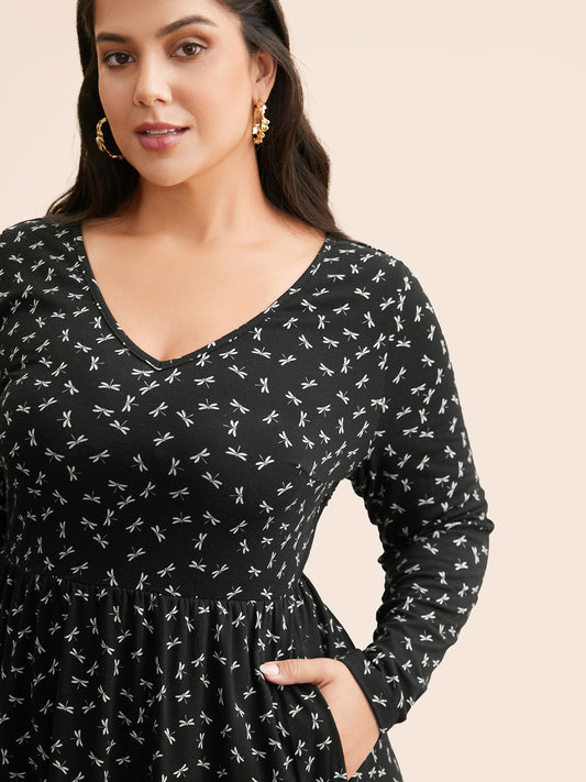 V Neck Dragonfly Pattern Midi Dress