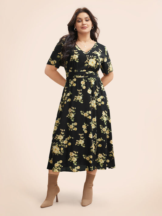 Shirt Collar Plants Print Belted Dress
