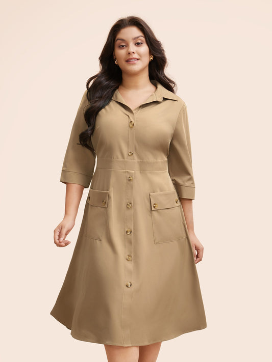Shirt Collar Elastic Waist Patch Pocket Dress