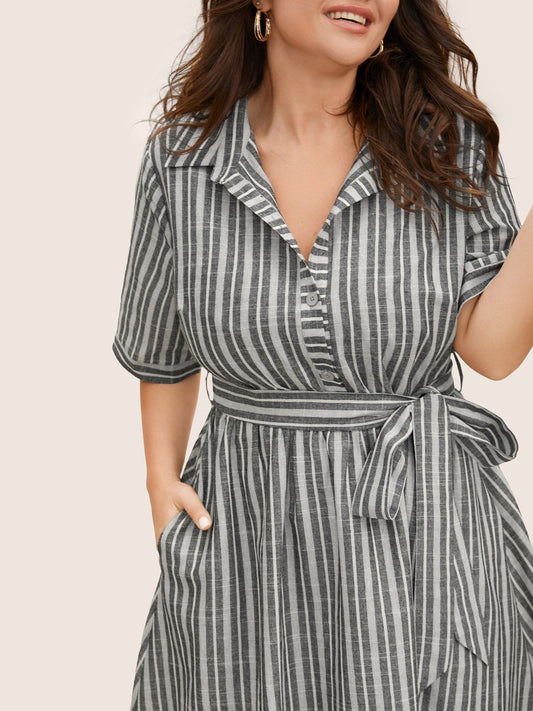 Shirt Collar Pleated Button Detail Gathered Midi Dress