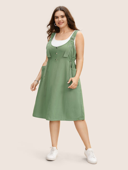 U Neck Button Detail Patched Pocket Drawstring Dress